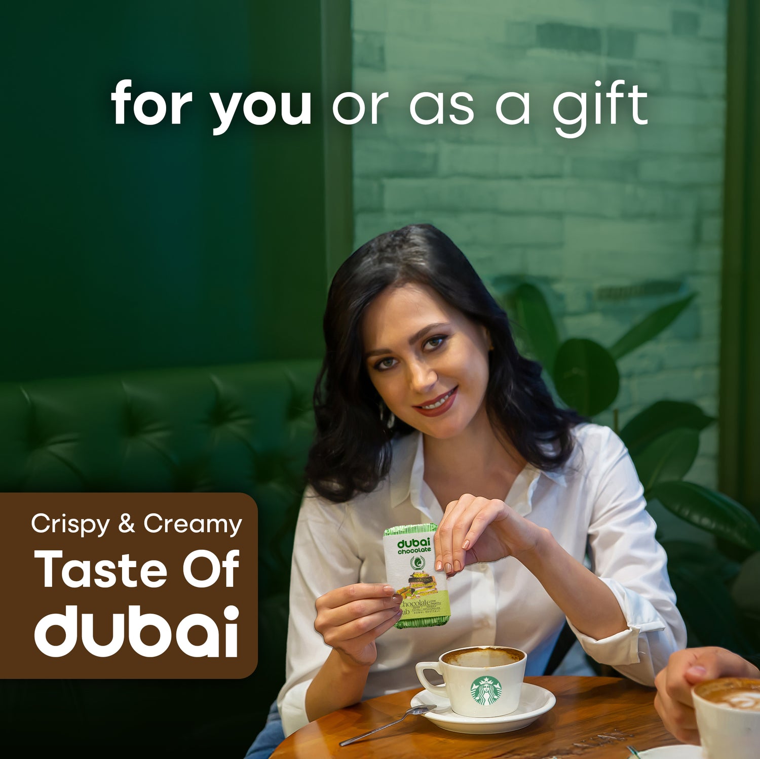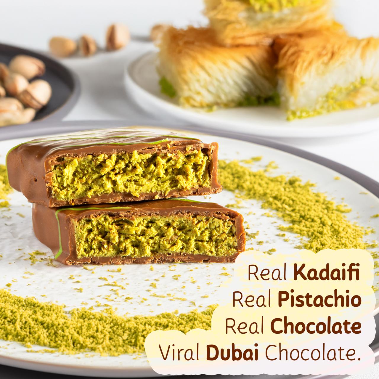 Delicious Dubai chocolate bars; filled with crispy kunafa and premium pistachios for a unique flavor combination.